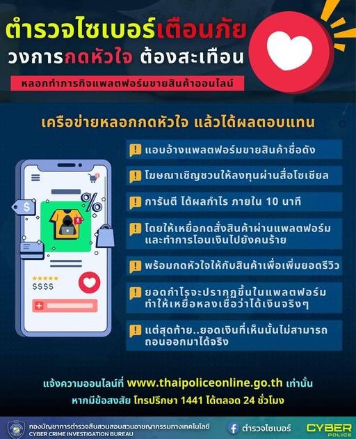 #ตำรวจไซเบอร์ #เตือนภัย #หลอกโอนเงิน #หลอกทำภารกิจ #กดหัวใจ