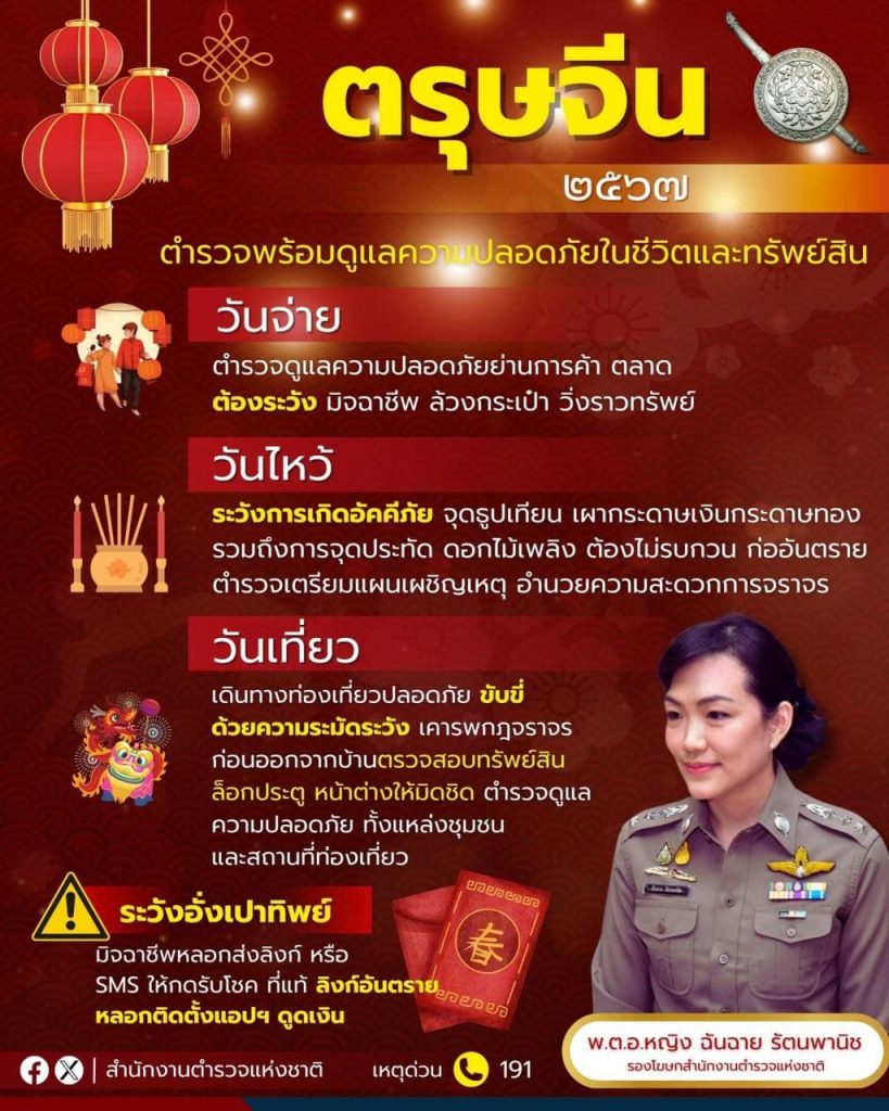 ข่าวประชาสัมพันธ์ 7 กุมภาพันธ์ 2567 โดย thamo_wpdb / ข่าวประชาสัมพันธ์,ข่าวประชาสัมพันธ์,ข่าวประชาสัมพันธ์เตือนภัย เตือนภัยออนไลน์!!! หลอกกดลิงก์แจกอั่งเปา มอบโชคโปรดระวังการหลอกลวงเอาทรัพย์สินจากกลุ่มมิจฉาชีพ ที่ใช้วิธีแอบอ้างในรูปแบบต่าง ๆ รวมถึงการแอบอ้างทางออนไลน์ โดยการส่งลิงก์ หรือข้อความ SMS หลอกลวงว่ารับโชคใหญ่ ได้รับอั่งเปา หรือของขวัญ ขออย่าเชื่อ อย่ากดลิงก์ ระวังการแฝงไวรัส หรือแอปพลิเคชันควบคุมโทรศัพท์มือถือแล้วดูดเงินออกจากบัญชี.แจ้งเหตุโทรศัพท์สายด่วน 191 และ 1599หากถูกหลอกลวงทางออนไลน์ โทร.1441เพื่อระงับ อายัดเงิน ตลอด 24 ชั่วโมง หรือ #แจ้งความออนไลน์ ที่ www.thaipoliceonline.go.th FacebookFacebookXXLINELine