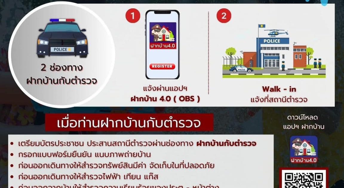 ข่าวประชาสัมพันธ์ 6 เมษายน 2567 โดย thamo_wpdb / ข่าวประชาสัมพันธ์,ข่าวประชาสัมพันธ์,ข่าวประชาสัมพันธ์เตือนภัย ฝากบ้านกับตำรวจ .วางแผนก่อนเดินทางช่วงสงกรานต์ 2567 และฝากบ้านไว้ ให้ตำรวจช่วยดูแล.อัปเดต 2 ช่องทางฝากบ้านกับตำรวจ.1. แอปฯ ฝากบ้าน 4.0 ดาวน์โหลดผ่านแอปสโตร์ หรือ กูเกิ้ลเพลย์.2.วอล์กอินที่สถานีตำรวจใกล้บ้าน.แนะนำสิ่งที่ต้องเตรียมพร้อม อาทิ สำรวจทรัพย์สินมีค่าจัดเก็บให้ปลอดภัย สำรวจไฟฟ้า ธูป เทียน เพื่อป้องกันอัคคีภัย สำรวจความเรียบร้อยของประตู หน้าต่าง ฯลฯ.#ฝากบ้านกับตำรวจ#สงกรานต์2567#สำนักงานตำรวจแห่งชาติ#Royalthaipolicehttps://www.facebook.com/share/p/q4Jn229GcwTFPhY5/?mibextid=CTbP7E FacebookFacebookXXLINELine