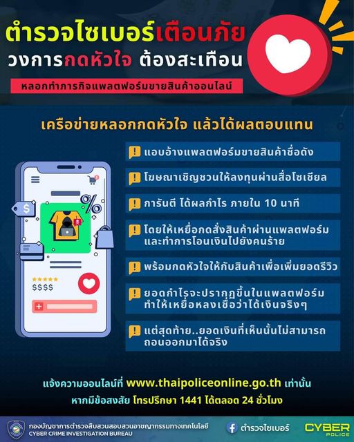 กดหัวใจให้ไม่ได้แปลว่าชอบ แต่อาจกำลังโดนหลอกอยู่ก็ได้ .มุขใหม่มิจฉาชีพ อ้างกดหัวใจรีวิวสินค้า หลอกโอ